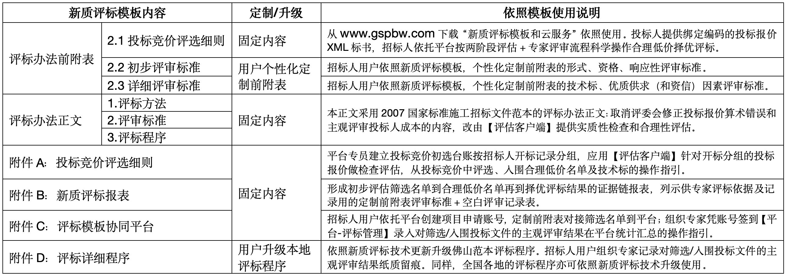 采用国家发改委等九部门2007年版国标《标准施工招标文件》第三章评标办法范本,融合两阶段评估+专家评审的新质评标技术,弥补市场失灵更好发挥招投标竞争择优作用,制成供招标人直接引用的新质评标模板,包括经评审的最低投标价法、综合评估法、综合评估法(合格制)3个模板。